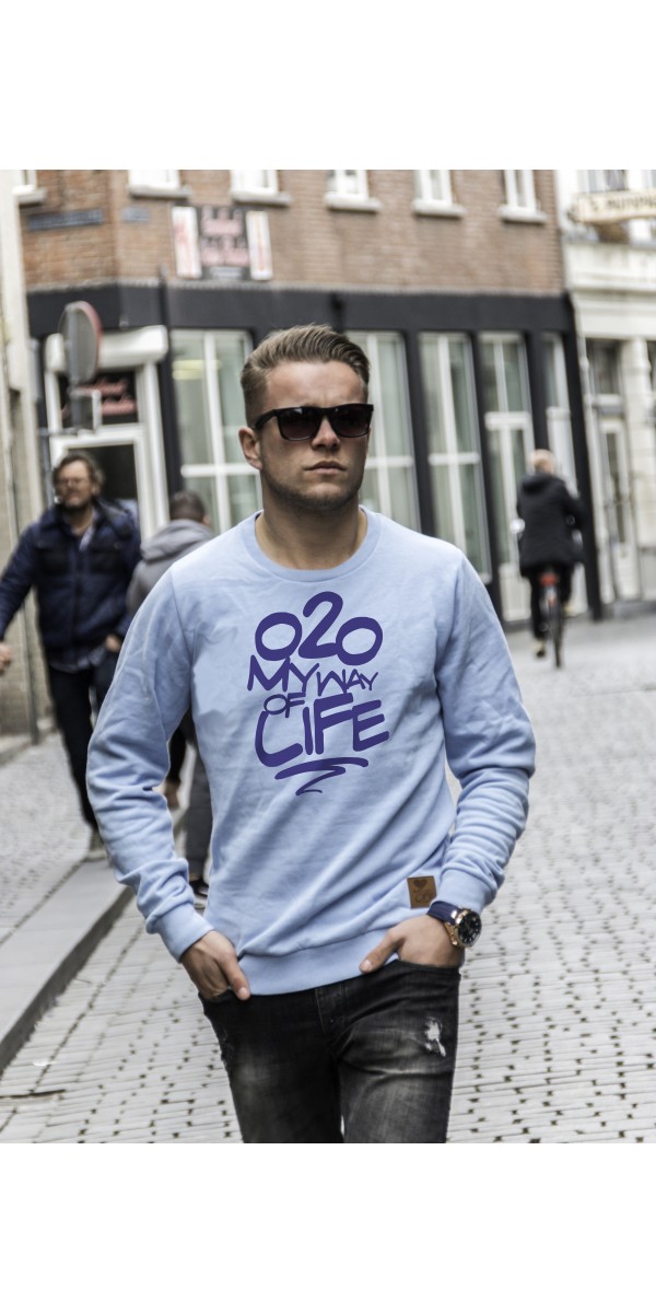Licht blauwe sweater met een blauwe opdruk van 020 My way of life